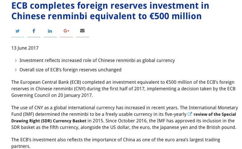 在美聯(lián)儲加息之前,6月13日,歐洲央行突然宣布:增持價(jià)值5億歐元的人民幣作為外匯儲備。這是歐洲央行首次持有人民幣外匯儲備。歐洲央行增持人民幣的決定,最早要追溯到1月20日。雖然這個決定早早做出,但一直沒有找到合適的機(jī)會。