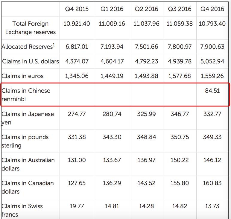 “官方外匯儲備貨幣構(gòu)成”是IMF統(tǒng)計(jì)部管理的一個數(shù)據(jù)庫,其中包含報(bào)告國家/轄區(qū)的期末季度數(shù)據(jù)。在單獨(dú)列出人民幣儲備信息后,該數(shù)據(jù)現(xiàn)已包括了8種貨幣:美元、歐元、人民幣、日元、英鎊、澳元、加元、瑞士法郎。