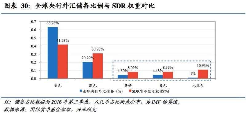 興業(yè)研究今年1月的《人民幣國際化半年報(bào)》中就曾分析到,全球央行對于人民幣的儲備需求將逐漸增加 。全球SDR總量為1826億,折成美元僅約3000億美元。以人民幣所占SDR份額10.92%的比例進(jìn)行折算,人民幣由SDR作為收支結(jié)算而引起的增配效果大約為2000億人民幣左右。
