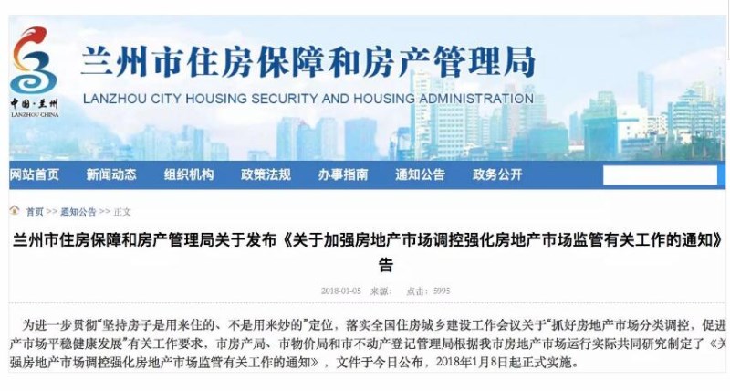 1月5日,蘭州市住房保障和房產管理局發布通知,1月8日起,對現行房地產市場調控政策將進行調整,該調整包括兩個部分,取消限購和限售措施。